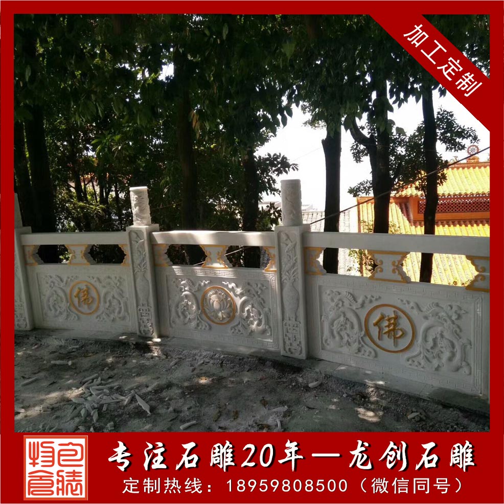 項目名稱:漢白玉欄桿安裝地點:廣東梅州靈化寺材質:漢白玉漢白玉的優點:其顏色潔白,石質堅硬,在陽光的照射下閃閃發光,有種高貴的氣息,而且漢白玉自身材質的特點可以雕刻出各種圖案,各種人物像、花草圖案、場景等等。漢白玉欄桿以優質的漢白玉石材為基礎,加以高浮雕、淺浮雕、透雕等各種石材雕刻技術,打造出一件件令人贊嘆的漢白玉欄桿作品。龍創石雕是一家專業石欄桿制造商,多年來一直專注在石欄桿的生產。如果您有石材欄桿工藝質量,石材欄桿大小,石欄桿的價格等等相關問題,歡迎致電龍創石雕的業務經理咨詢。