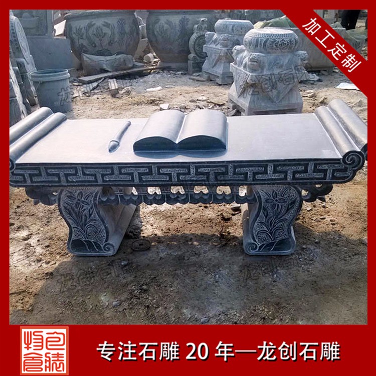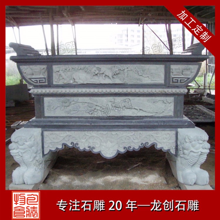 石雕供桌常見款式為長方形,石頭材質屬于青石,面中間是一精致的神臺供桌,雕刻一龍王看廟,高度約與方桌相等。祭祀時常供設香爐、蠟竿和擺放供品,此為石頭所制,故名石供桌(神臺)。供桌常見幾種地方擺放,廳堂供桌、佛堂供桌、寺廟供桌、神臺供桌等,與其配套的有香爐、石鼎。龍創石雕有限公司為石雕供桌定做廠家、青石供桌生產加工廠家、漢白玉供桌生產加工廠家,提供各式石材供桌加工,青石九龍供桌、專業生產青石供桌、花崗巖供桌、大理石供桌、青石供桌批發、供桌生產加工等等。