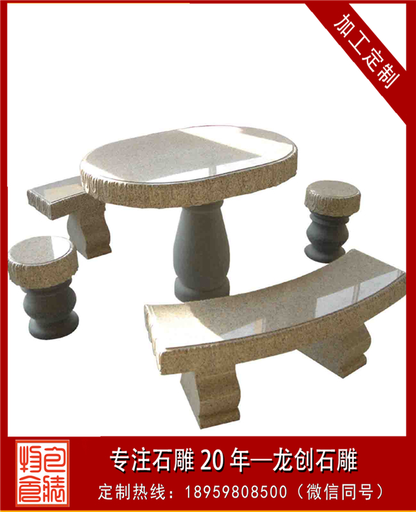 利用石材的石桌椅雖然堅硬,但是可塑性強,不易損壞,可制作造型多樣的石桌椅。最為簡單的石桌椅有由簡單修飾的圓柱坐凳與圓板組成的一組石桌椅,還有用幾塊石板組成的石靠背椅、長椅或者單椅等。還可以做進一步雕塑,可江坐凳打磨成葫蘆形或者雕塑各種花紋,還可將坐凳雕塑成動物坐凳、手坐凳等其他藝術造型。靠背椅還可仿沙發形狀來進行雕塑,可長方形也可做成弧形。長椅不單可做直線,也可做曲線,整石打磨或者把兩側做成動物造型。而單椅能雕刻成各種各樣動物造型,還能根據需要來選擇大小。